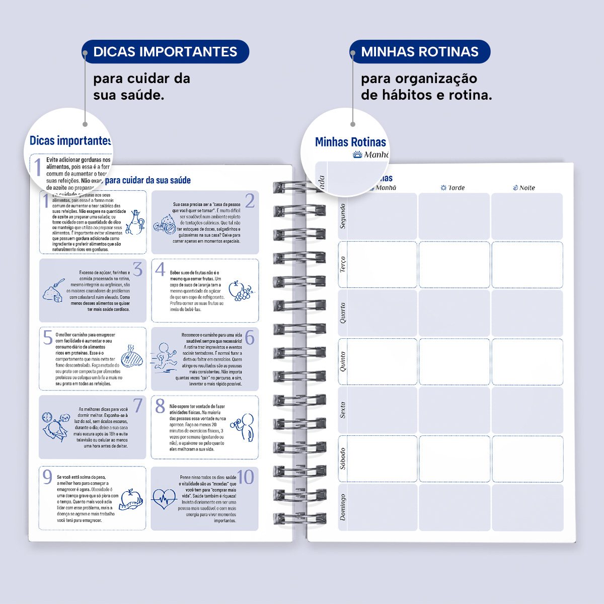 A cada mês, você pode contar com uma página de planejamento mensal, facilitando a visualização de suas principais anotações. Além disso, cada página possui indicações de feriados, estações do ano, calendário lunar, número da semana, frases inspiradoras e um calendário linear do mês no rodapé.