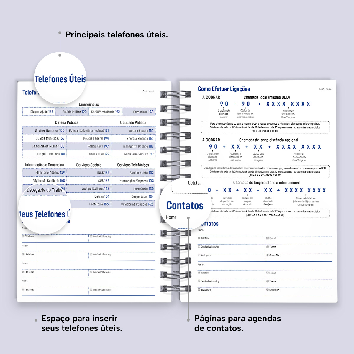 Ao final da agenda, há uma página com os principais números de telefone úteis, além de instruções sobre como efetuar ligações, uma seção dedicada a contatos, uma página em formato “bullet list” para itens de lista, páginas para anotações livres e um mapa do Brasil.