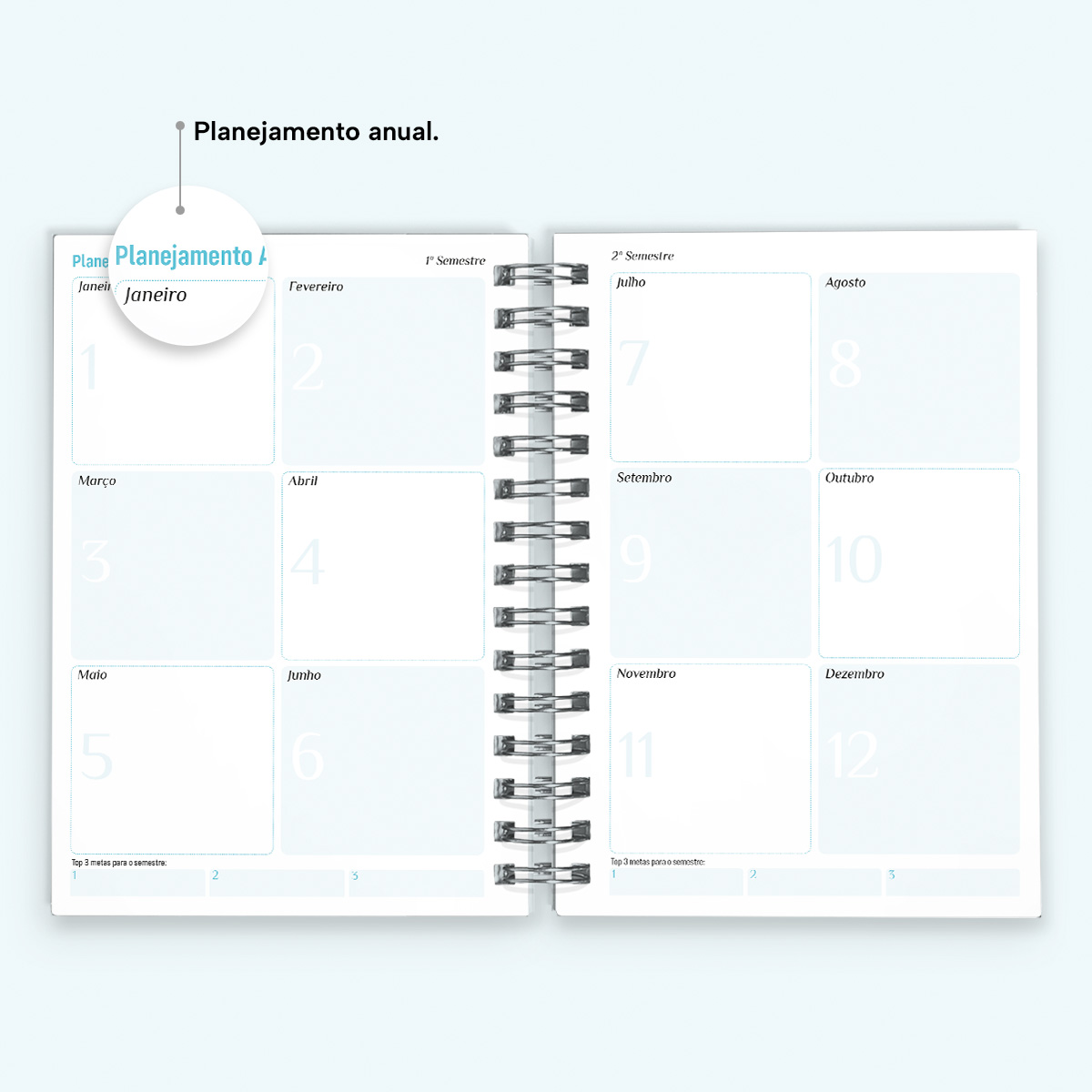 Em seguida, há uma visão geral do calendário completo de 2026, seguido de um planejamento anual para registrar seus objetivos e metas para cada semestre.
