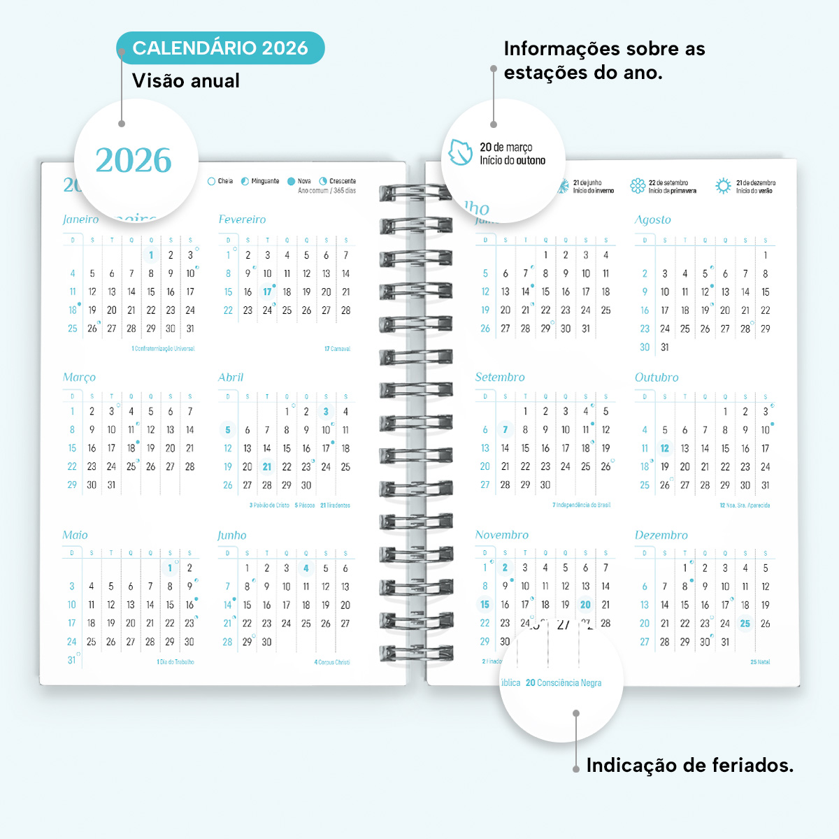 A cada mês, você pode contar com uma página de planejamento mensal, facilitando a visualização de suas principais anotações. Além disso, cada página possui indicações de feriados, estações do ano, calendário lunar, número da semana, frases inspiradoras e um calendário linear do mês no rodapé.