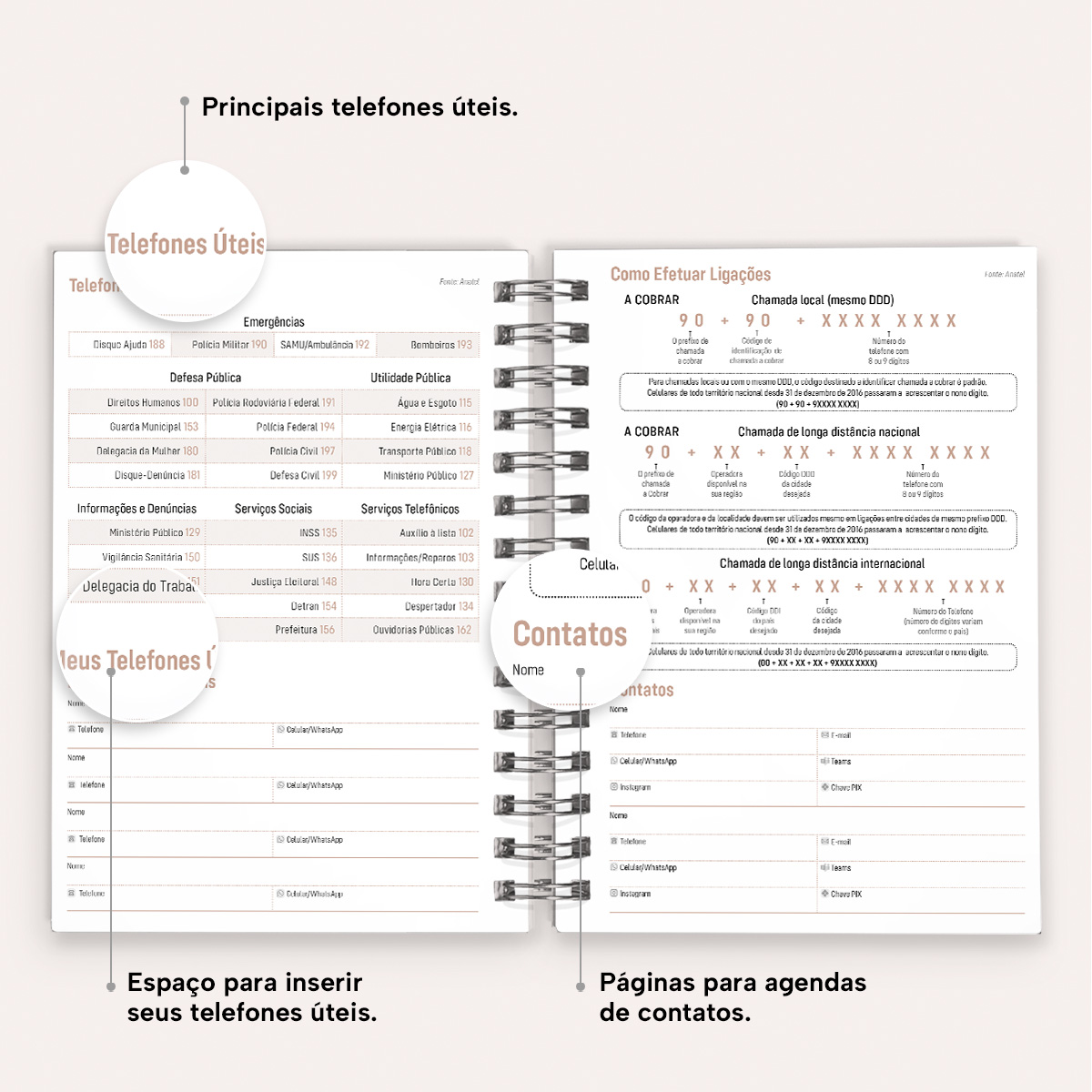 Ao final da agenda, há uma página com os principais números de telefone úteis, além de instruções sobre como efetuar ligações, uma seção dedicada a contatos, uma página em formato “bullet list” para itens de lista, páginas para anotações livres e um mapa do Brasil.