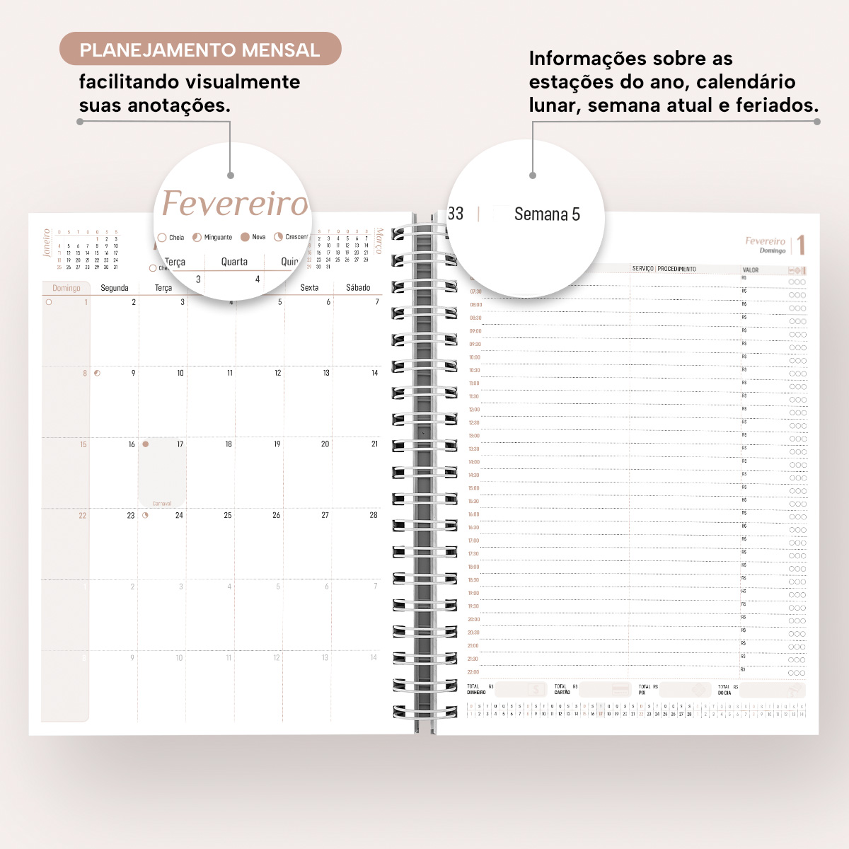 No início de cada mês, há um planejamento mensal, facilitando visualmente as suas principais anotações, e ao final, um fechamento financeiro para descrever todas as entradas e despesas e/ou investimentos, possibilitando mensurar e controlar o resultado total dos meses.