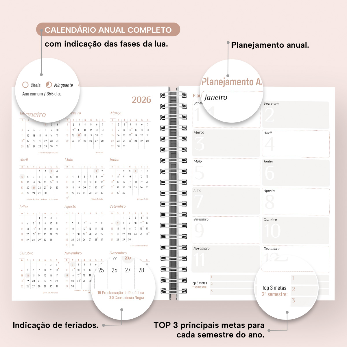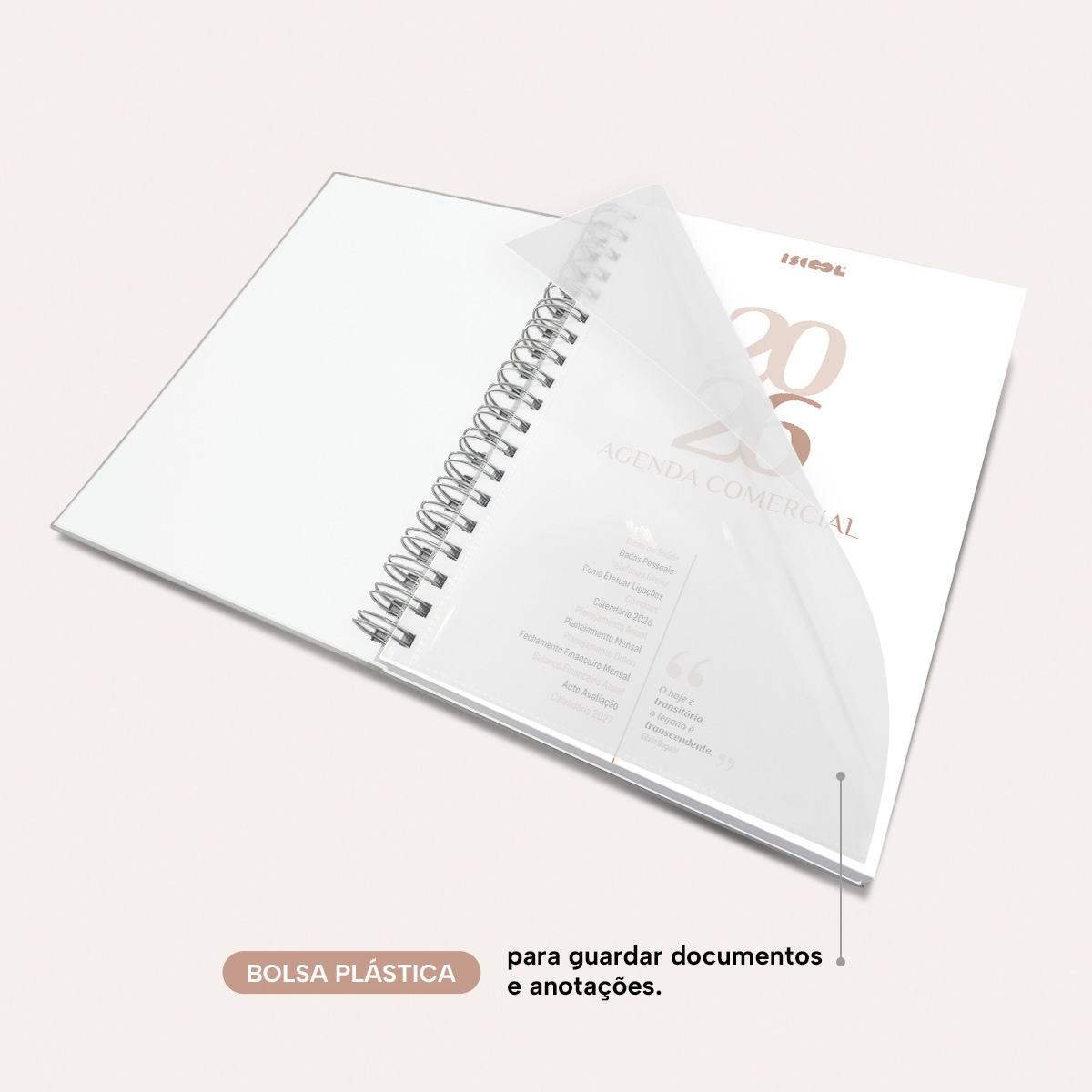 Logo no início, você pode preencher todos os seus dados pessoais, comerciais e emergenciais. Na sequência, temos uma lista de telefones úteis, instruções sobre como efetuar ligações, uma agenda de contatos, visão do calendário completo de 2026 e um planejamento anual para anotar os objetivos e metas de cada semestre.