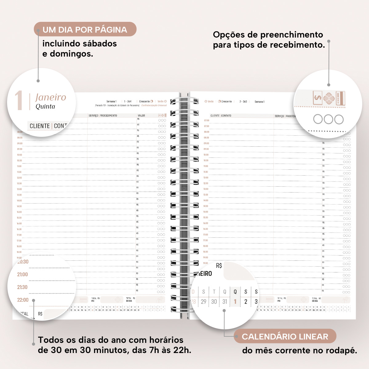 A agenda comercial possui marcação dos horários divididos de 30 em 30 minutos, abrangendo o dia todo de trabalho, das 7h às 22h. Seu grande diferencial são as pautas, com colunas para você marcar o nome do cliente, o contato, o serviço/procedimento realizado, o valor e até mesmo a forma de pagamento! Ao final de cada página, você pode inserir também o valor total das receitas (faturamento) do dia.