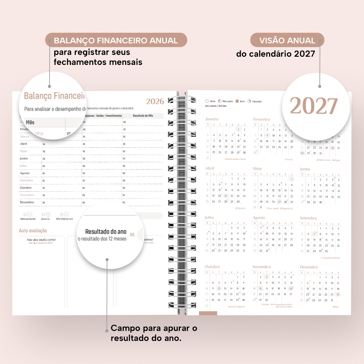No final da agenda, ainda temos o balanço financeiro anual para você registrar o fechamento de cada mês e apurar o resultado do ano.