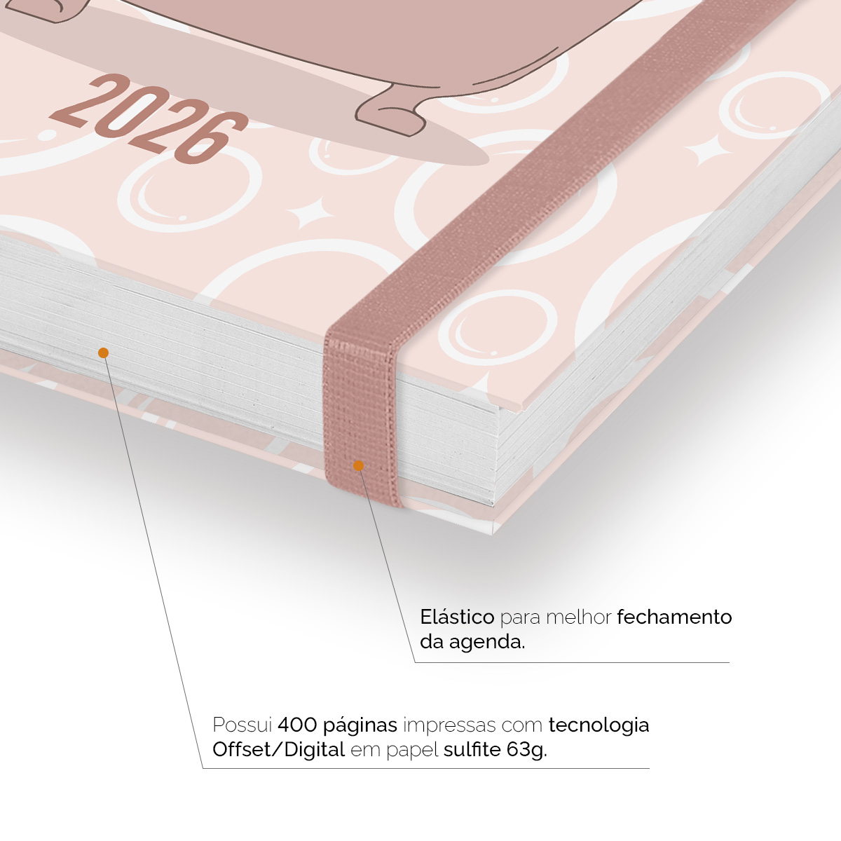 Logo no início, você pode preencher todos os seus dados pessoais, comerciais e emergenciais. Na sequência, temos uma lista de telefones úteis, instruções sobre como efetuar ligações, uma agenda de contatos, visão do calendário completo de 2026 e um planejamento anual para anotar os objetivos e metas de cada semestre.