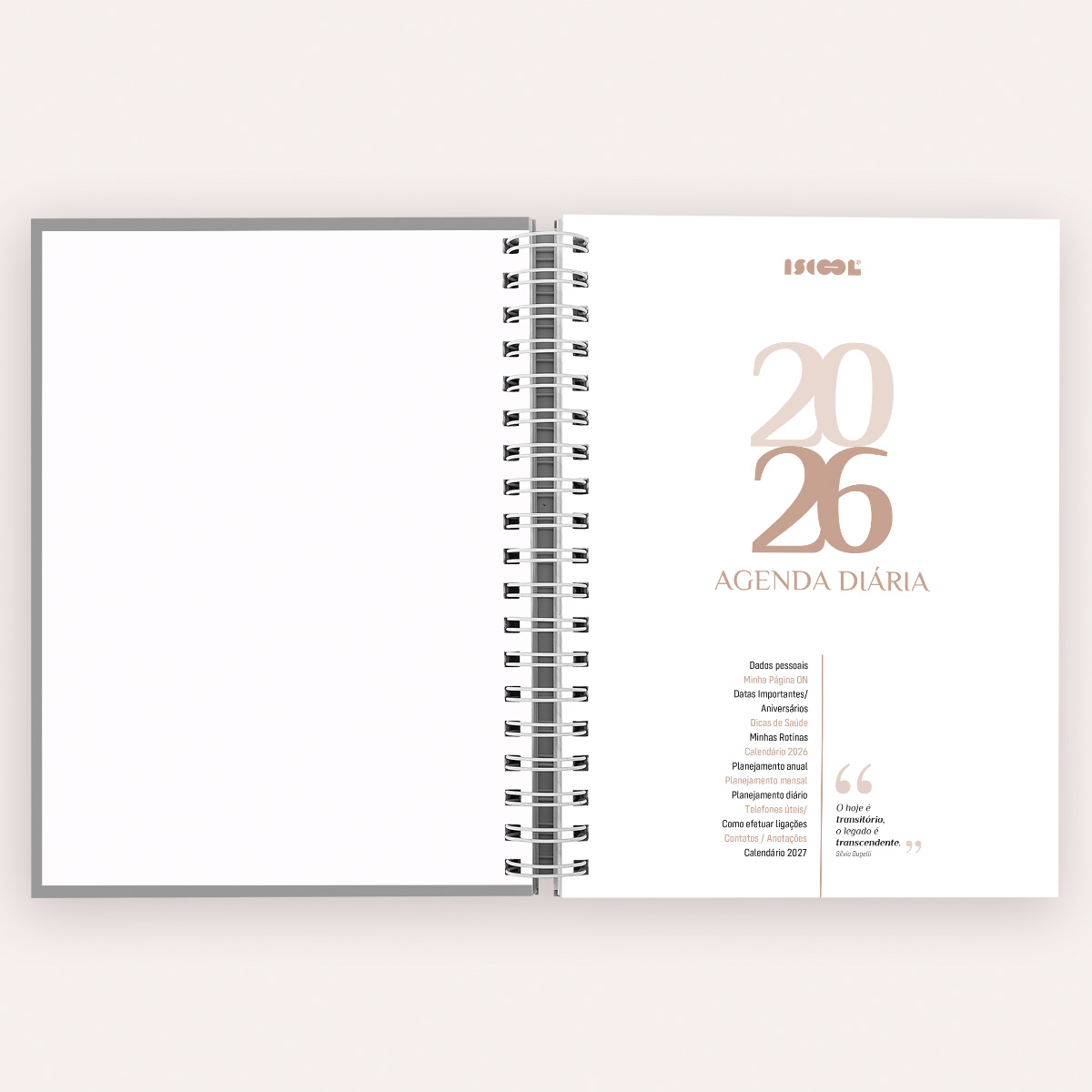 Na sequência temos a visão do calendário completo de 2026 seguido de um planejamento anual para anotar os objetivos e metas de cada semestre.