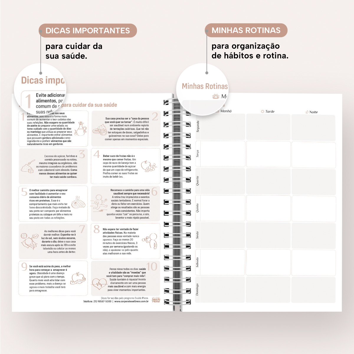 Logo no início, você poderá inserir todos os dados pessoais, comerciais e emergenciais, seguido pela “Minha Página ON”, ideal para registrar suas contas digitais, com seus respectivos logins e senhas, e uma página de “Datas Importantes/Aniversários”, com os 12 meses do ano organizados para você anotar aniversários e datas a serem lembradas e também uma página para organização de rotina.