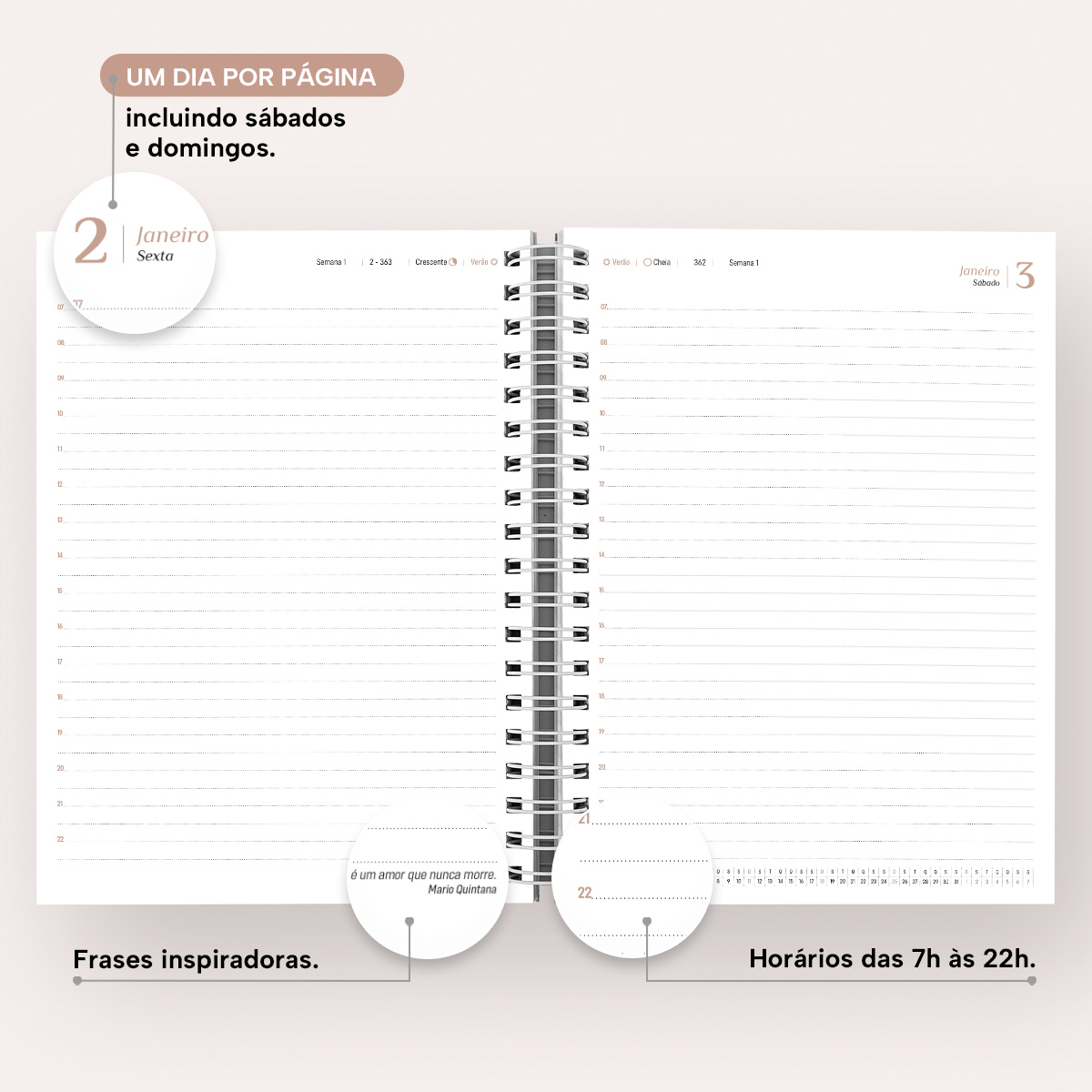 Em cada mês você pode contar com uma página de planejamento mensal, facilitando visualmente as suas principais anotações. Além disso, cada página possui indicação de feriados, das estações do ano, calendário lunar, indicador do número da semana, frases inspiradoras e um calendário linear do mês no rodapé.