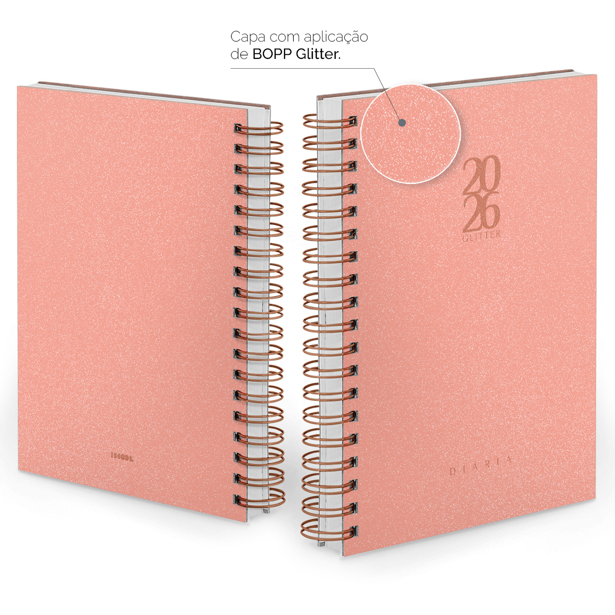 Nossa agenda possui um acabamento especial com BOPP glitter que proporciona o efeito de brilho glitter que se destaca sob luz intensa, e o melhor de tudo é que o glitter não solta!
