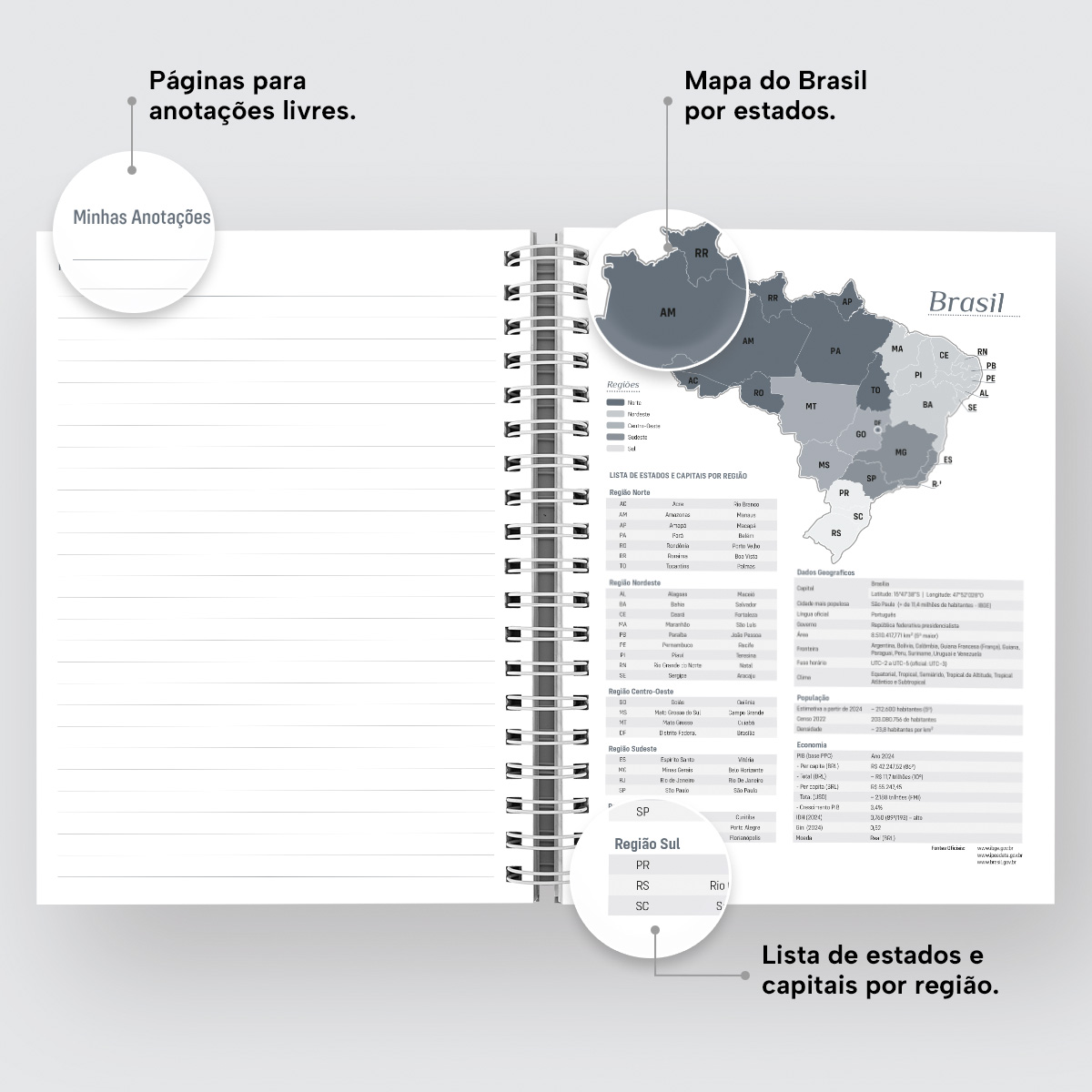 Em cada mês você pode contar com uma página de planejamento mensal, facilitando visualmente as suas principais anotações. Além disso, cada página possui indicação de feriados, das estações do ano, calendário lunar, indicador do número da semana, frases inspiradoras e um calendário linear do mês no rodapé.