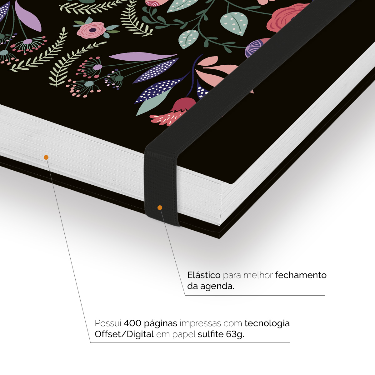 Em cada mês você pode contar com uma página de planejamento mensal, facilitando visualmente as suas principais anotações. Além disso, cada página possui indicação de feriados, das estações do ano, calendário lunar, indicador do número da semana, frases inspiradoras e um calendário linear do mês no rodapé.