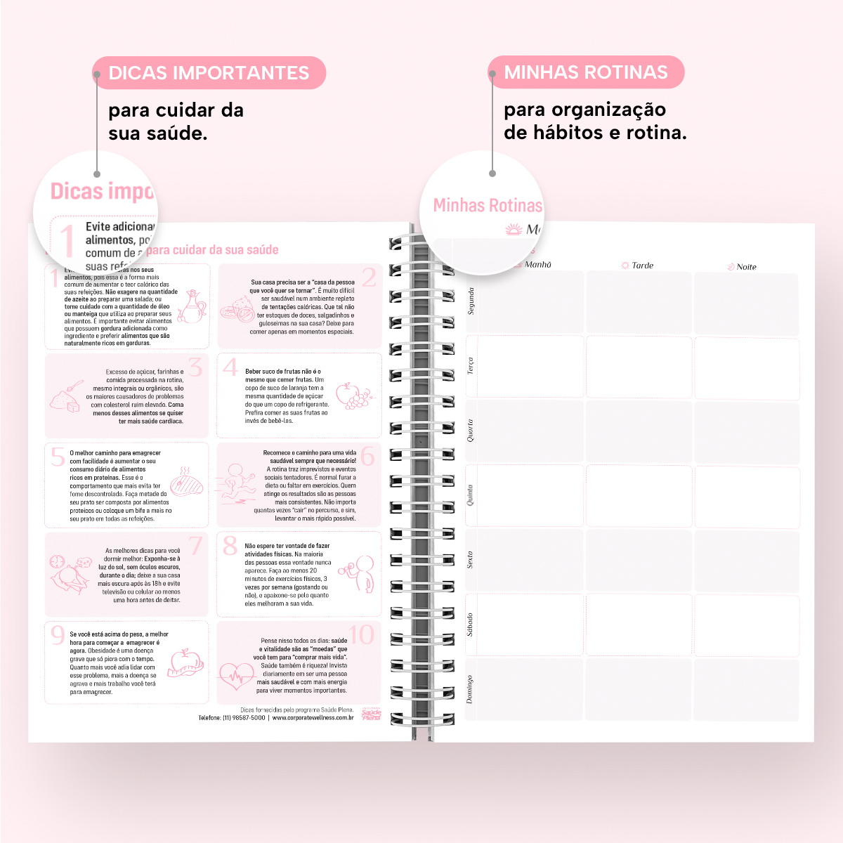 Logo no início, você poderá inserir todos os dados pessoais, comerciais e emergenciais, seguido pela “Minha Página ON”, ideal para registrar suas contas digitais, com seus respectivos logins e senhas, e uma página de “Datas Importantes/Aniversários”, com os 12 meses do ano organizados para você anotar aniversários e datas a serem lembradas e também uma página para organização de rotina.