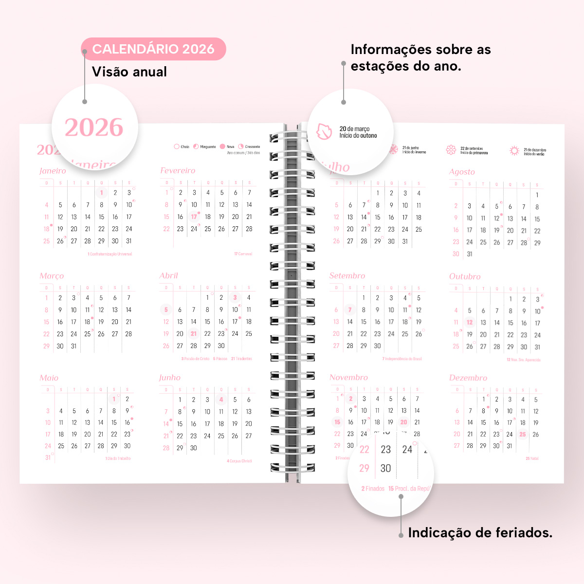 Em cada mês você pode contar com uma página de planejamento mensal, facilitando visualmente as suas principais anotações. Além disso, cada página possui indicação de feriados, das estações do ano, calendário lunar, indicador do número da semana, frases inspiradoras e um calendário linear do mês no rodapé.