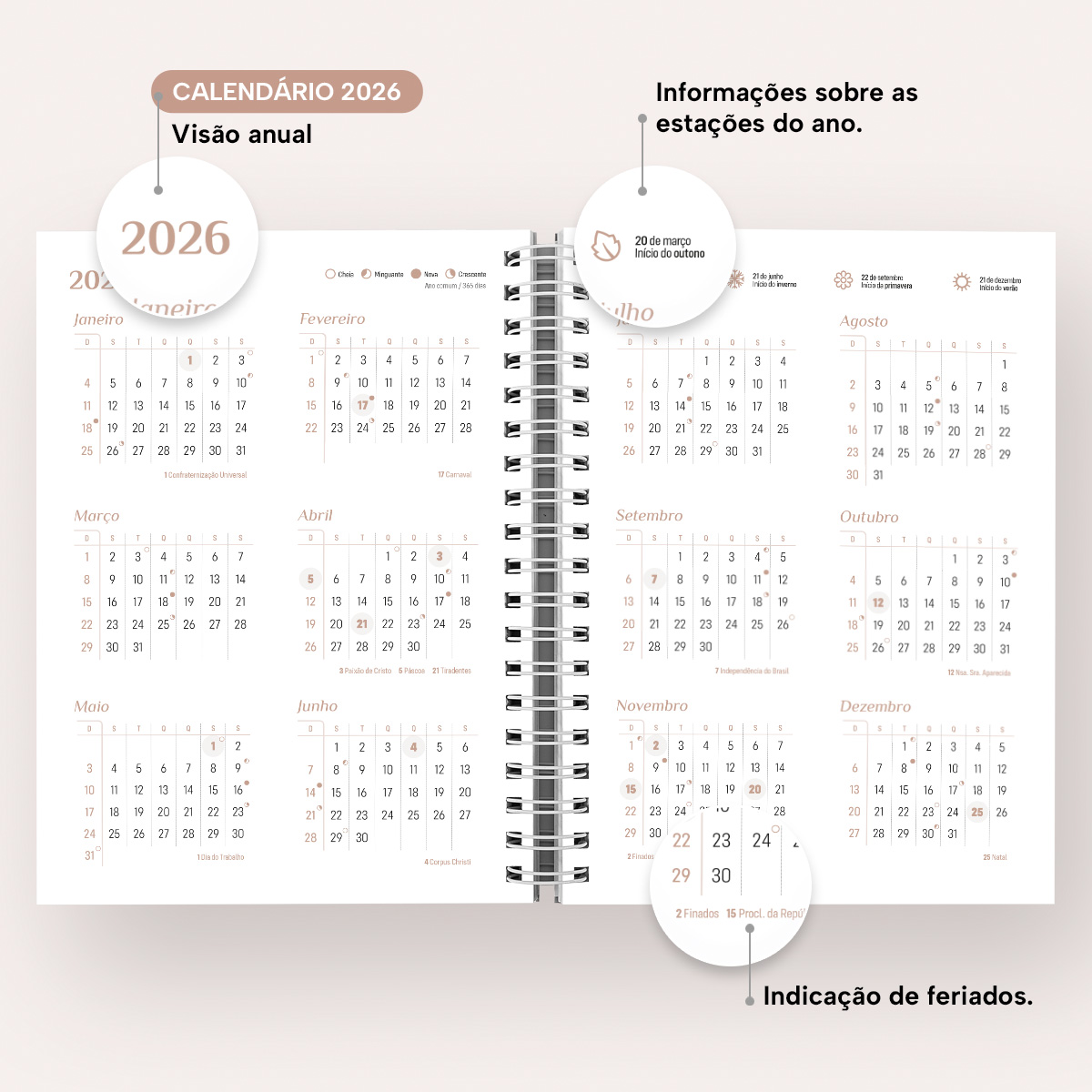Em cada mês você pode contar com uma página de planejamento mensal, facilitando visualmente as suas principais anotações. Além disso, cada página possui indicação de feriados, das estações do ano, calendário lunar, indicador do número da semana, frases inspiradoras e um calendário linear do mês no rodapé.