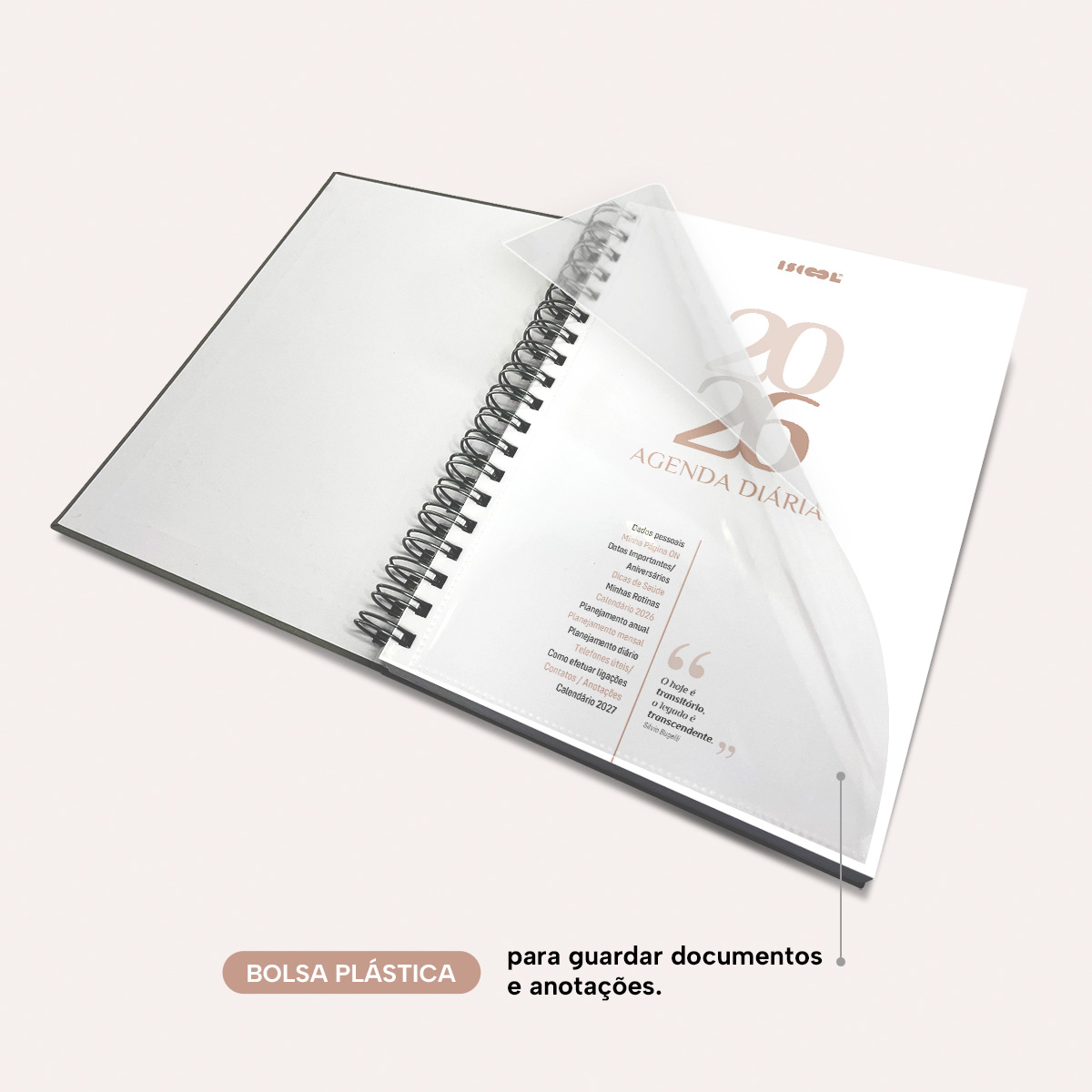 Bolsa plástica para guardar documentos e anotações.