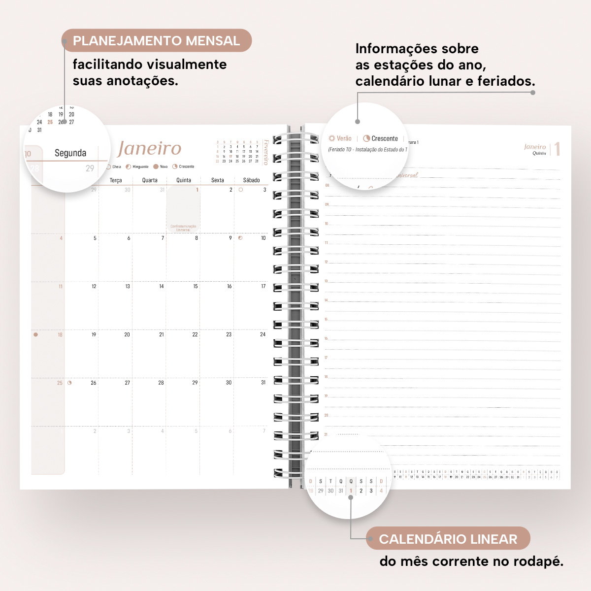 Em cada mês você pode contar com uma página de planejamento mensal, facilitando visualmente as suas principais anotações. Além disso, cada página possui indicação de feriados, das estações do ano, calendário lunar, indicador do número da semana, frases inspiradoras e um calendário linear do mês no rodapé.
