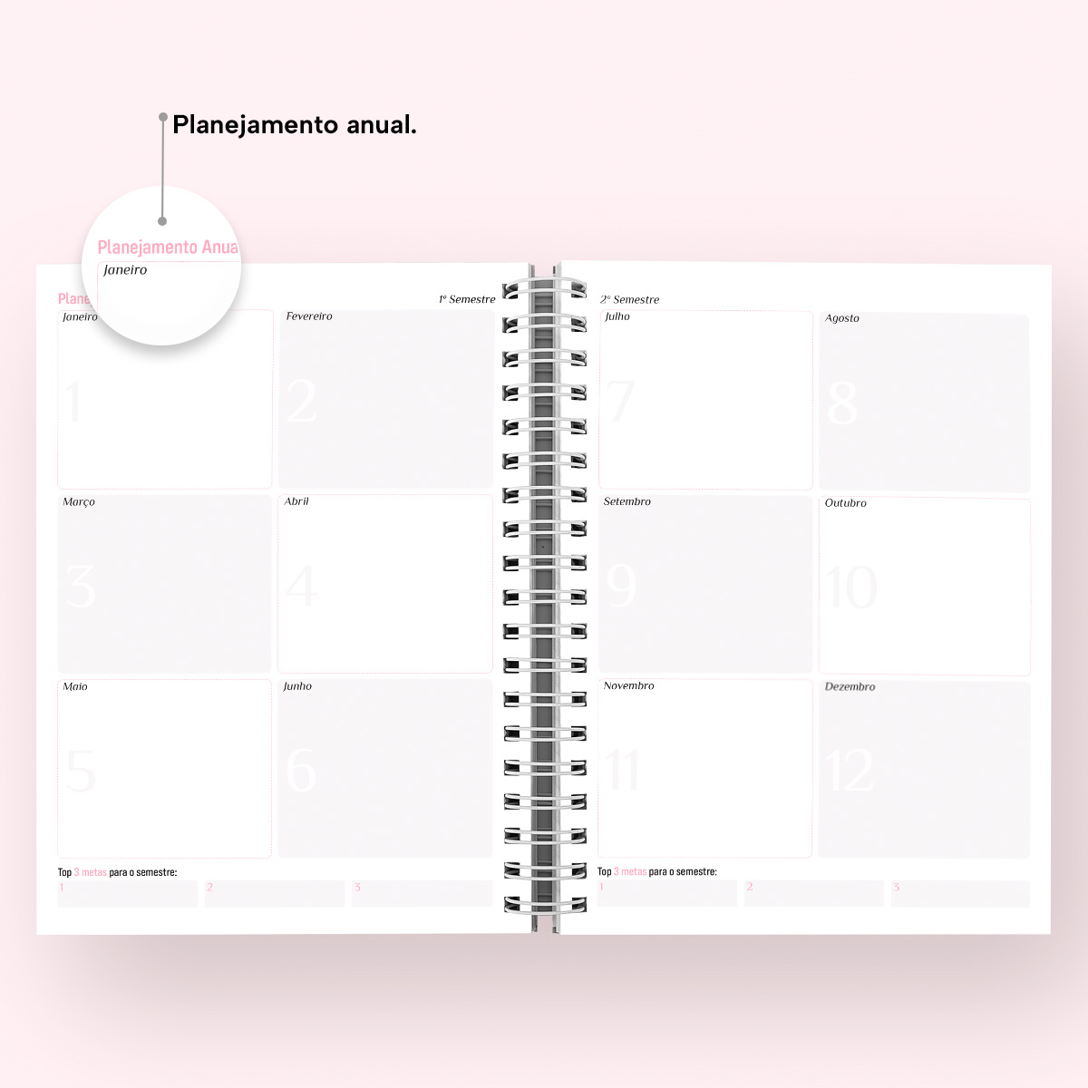 Em cada mês você pode contar com uma página de planejamento mensal, facilitando visualmente as suas principais anotações. Além disso, cada página possui indicação de feriados, das estações do ano, calendário lunar, indicador do número da semana, frases inspiradoras e um calendário linear do mês no rodapé.