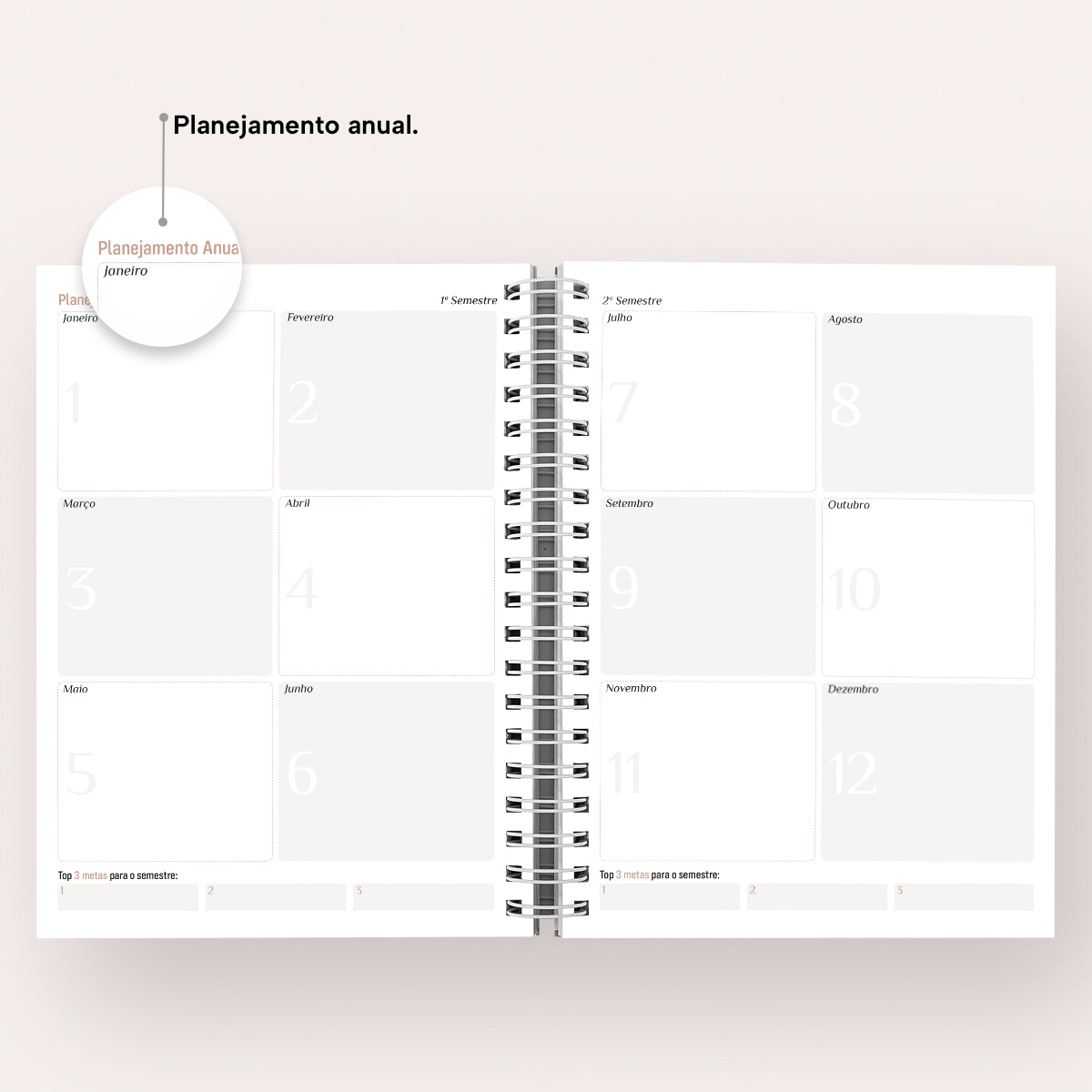 Na sequência temos a visão do calendário completo de 2026 seguido de um planejamento anual para anotar os objetivos e metas de cada semestre.