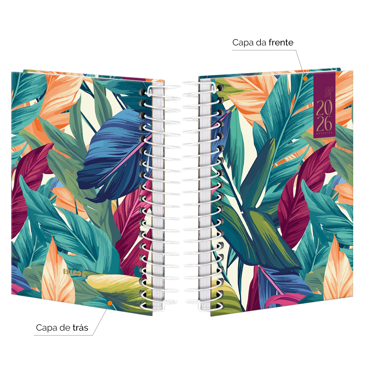 Logo no início, você pode preencher todos os seus dados pessoais, comerciais e emergenciais. Em seguida, há uma visão geral do calendário completo de 2026 e 2027, seguida de um planejamento anual para registrar seus objetivos e metas para cada mês.