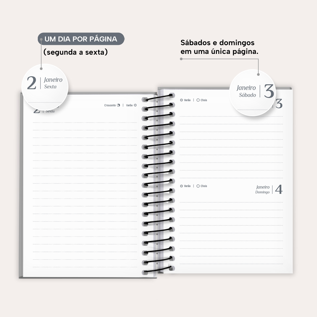 Os dias da semana, de segunda a sexta-feira, ocupam páginas inteiras. Você pode inserir manualmente os horários, permitindo flexibilidade para ajustar os compromissos e as linhas conforme sua necessidade. Já nos finais de semana, sábados e domingos compartilham a mesma página, com um espaço maior para o sábado.