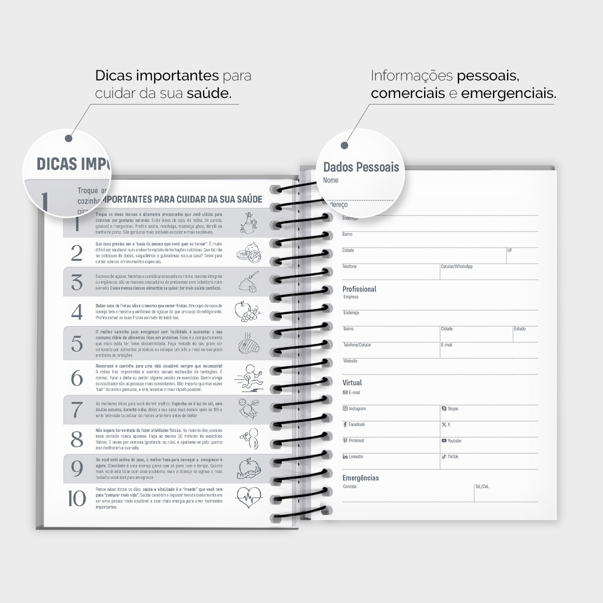 Logo no início, você pode preencher todos os seus dados pessoais, comerciais e emergenciais. Em seguida, há uma visão geral do calendário completo de 2026 e 2027, seguida de um planejamento anual para registrar seus objetivos e metas para cada mês.