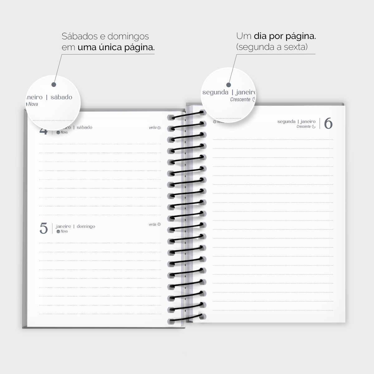 Os dias da semana, de segunda a sexta-feira, ocupam páginas inteiras. Você pode inserir manualmente os horários, permitindo flexibilidade para ajustar os compromissos e as linhas conforme sua necessidade. Já nos finais de semana, sábados e domingos compartilham a mesma página, com um espaço maior para o sábado.