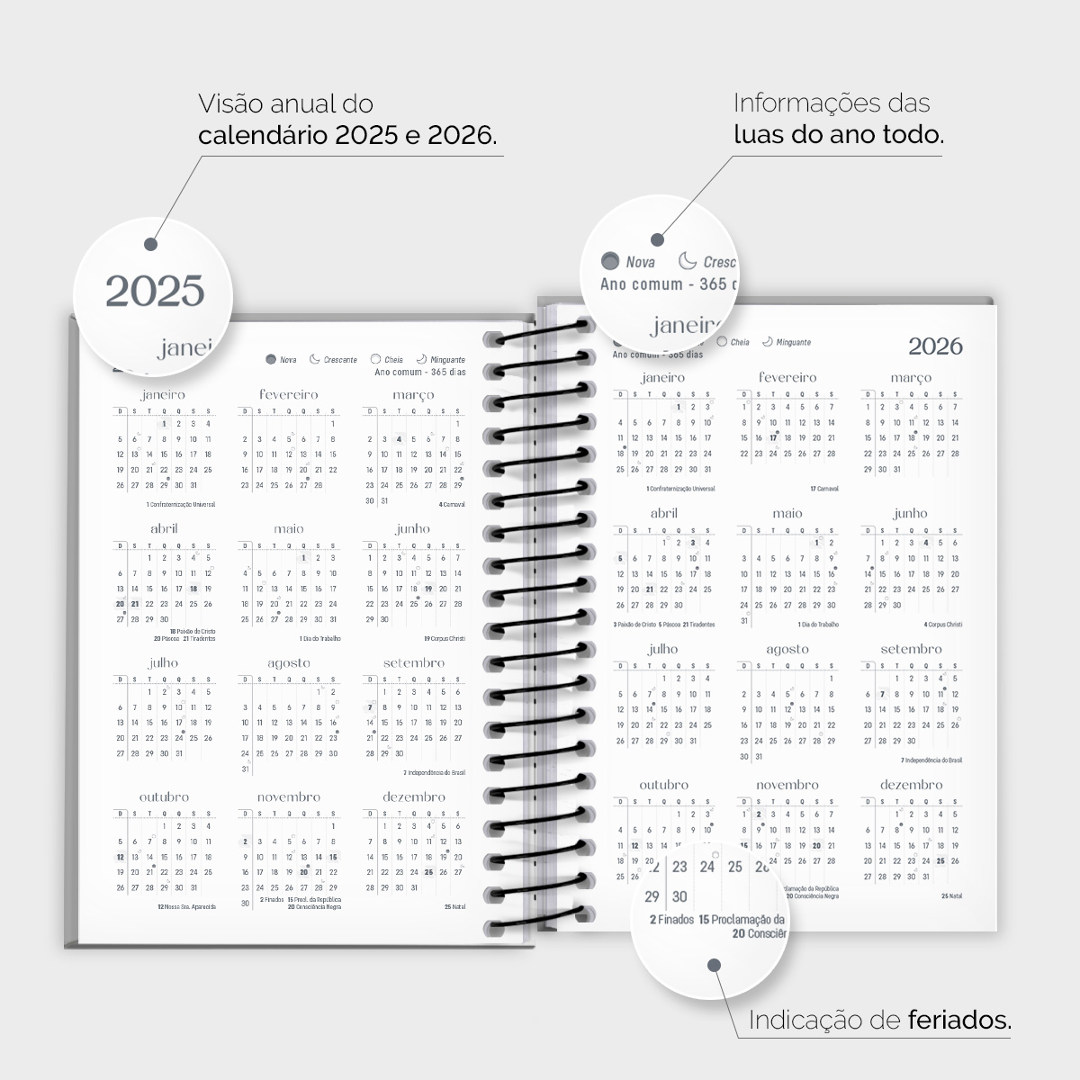 Cada página possui indicações de feriados, estações do ano e calendário lunar.