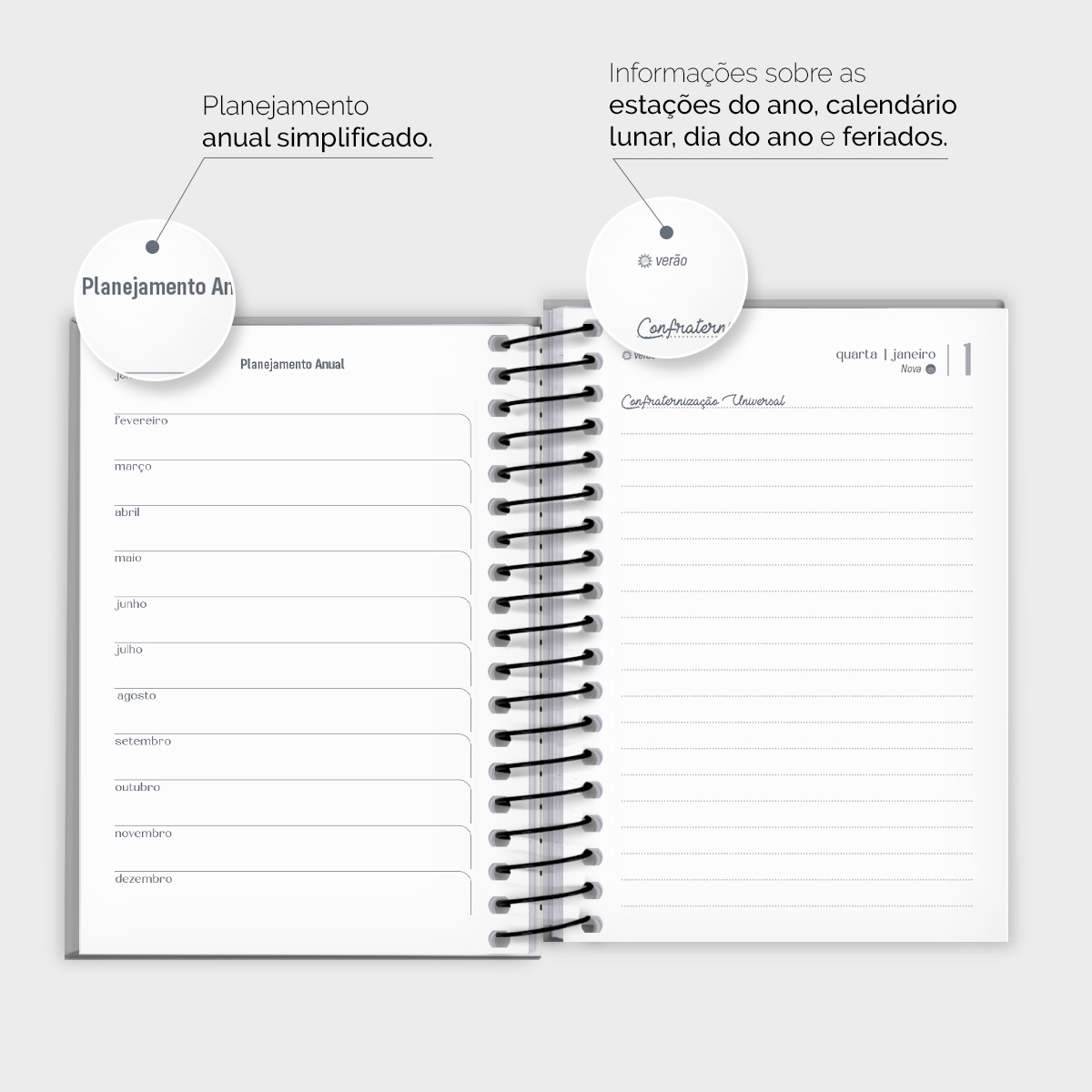 Logo no início, você pode preencher todos os seus dados pessoais, comerciais e emergenciais. Em seguida, há uma visão geral do calendário completo de 2026 e 2027, seguida de um planejamento anual para registrar seus objetivos e metas para cada mês.