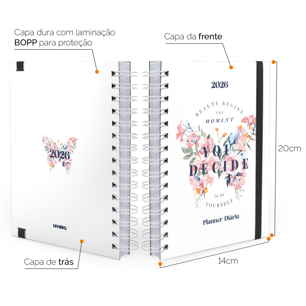 Agenda Planner Diária 2026 Butterfly Branco Rosa