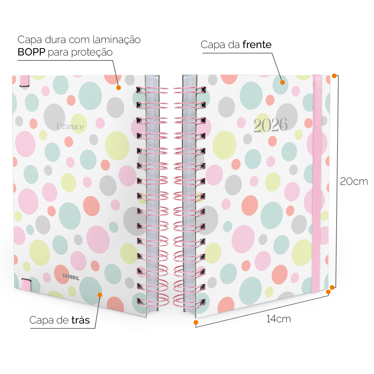 Com tamanho de 14 x 20 cm (próximo ao A5), esta agenda se destaca pelo formato de 1 dia por página, incluindo sábados, domingos e feriados. As linhas possuem marcação de horários a cada 30 minutos, das 7h às 21h30, permitindo uma organização completa do dia. Além disso, cada página oferece espaço para listar suas tarefas do dia (to-do), monitorar hábitos diários e registrar outras anotações importantes.