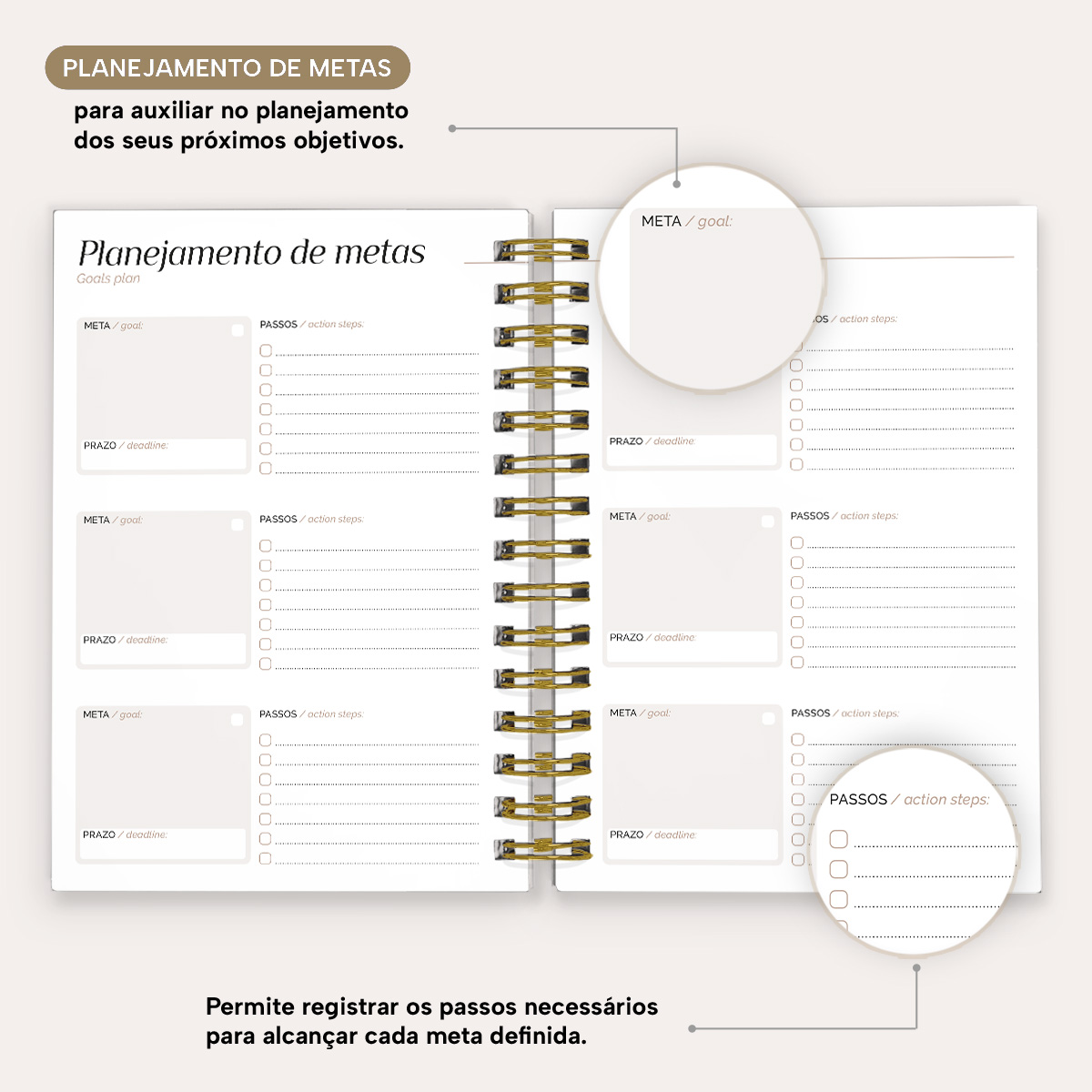 No início de cada mês, você encontra um planejamento mensal com blocos para anotar os principais eventos, uma página para controle de orçamento com receitas e despesas, e um espaço para planejar sua rotina alimentar.