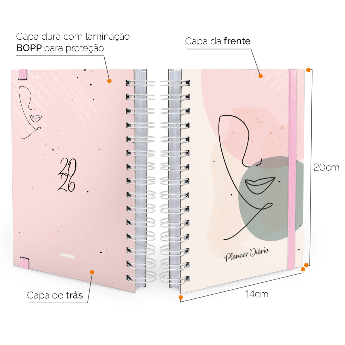 Com tamanho de 14 x 20 cm (próximo ao A5), esta agenda se destaca pelo formato de 1 dia por página, incluindo sábados, domingos e feriados. As linhas possuem marcação de horários a cada 30 minutos, das 7h às 21h30, permitindo uma organização completa do dia. Além disso, cada página oferece espaço para listar suas tarefas do dia (to-do), monitorar hábitos diários e registrar outras anotações importantes.