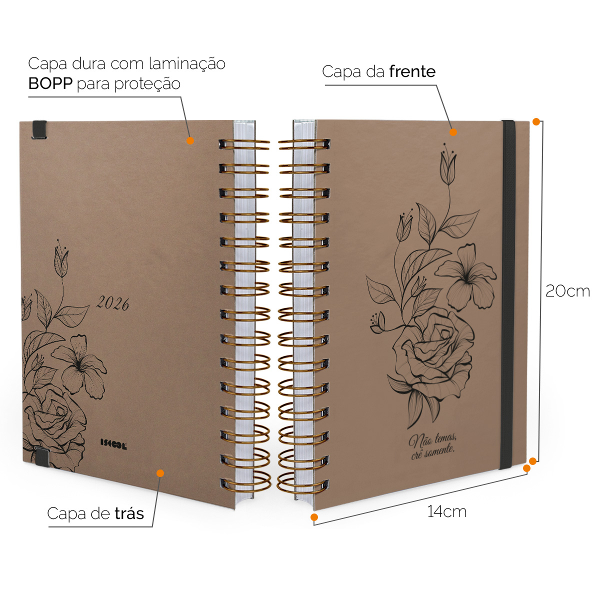 Com tamanho de 14 x 20 cm (próximo ao A5), esta agenda se destaca pelo formato de 1 dia por página, incluindo sábados, domingos e feriados. As linhas possuem marcação de horários a cada 30 minutos, das 7h às 21h30, permitindo uma organização completa do dia. Além disso, cada página oferece espaço para listar suas tarefas do dia (to-do), monitorar hábitos diários e registrar outras anotações importantes.