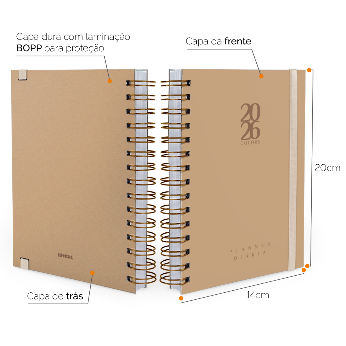 Com tamanho de 14 x 20 cm (próximo ao A5), esta agenda se destaca pelo formato de 1 dia por página, incluindo sábados, domingos e feriados. As linhas possuem marcação de horários a cada 30 minutos, das 7h às 21h30, permitindo uma organização completa do dia. Além disso, cada página oferece espaço para listar suas tarefas do dia (to-do), monitorar hábitos diários e registrar outras anotações importantes.