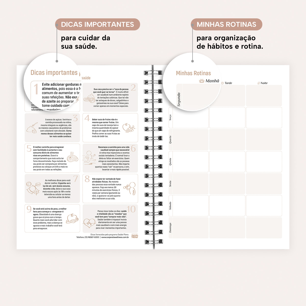 Ao final da agenda, há uma página com os principais números de telefone úteis, além de instruções sobre como efetuar ligações, uma agenda de contatos, um balanço financeiro anual, uma página com a ferramenta “Roda da Vida” para você comparar sua evolução pessoal em relação ao início do ano e o termômetro de metas, onde você poderá apurar os resultados de cada mês e fazer uma autoavaliação.