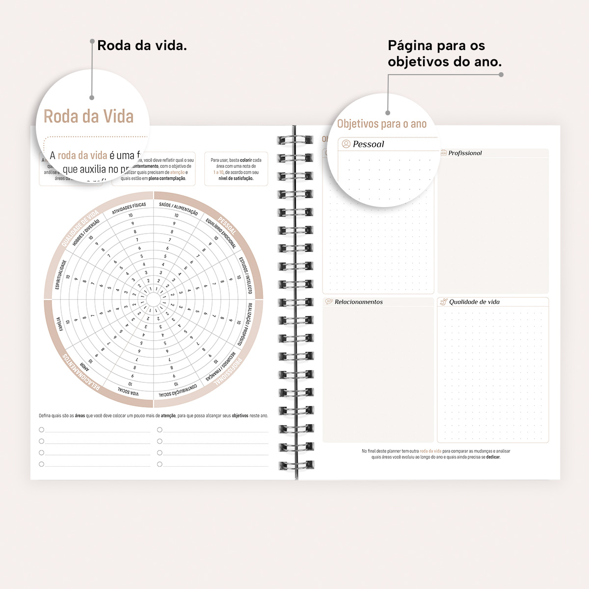 Em seguida, páginas para a ferramenta “Roda da Vida”, objetivos para o ano e organização da rotina. A seguir, há uma visão geral do calendário completo de 2026. Logo depois, temos o planejamento anual para anotar os objetivos e metas de cada semestre.