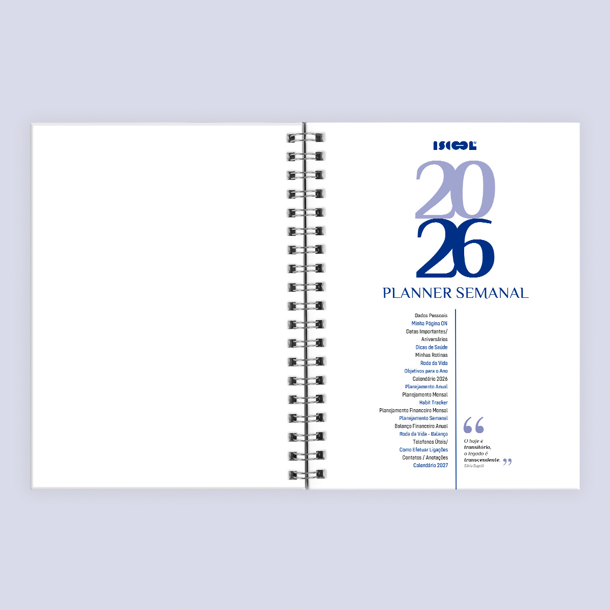 A agenda planner semanal da Iscool é perfeita para uso diário, seja na empresa, escritório, salão, clínica, escola, faculdade ou até mesmo em casa. Com ela, você pode agendar compromissos, eventos, tarefas, lembretes e contatos, tornando sua rotina mais funcional e produtiva.