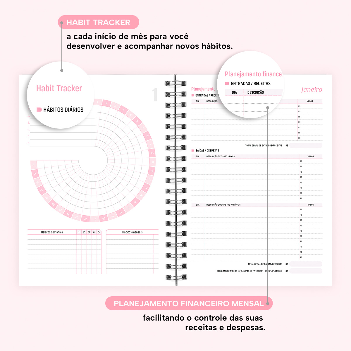 No início de cada mês, há um planejamento mensal, facilitando visualmente as suas principais anotações, um “Habit Tracker” para você desenvolver novos hábitos ou controlar os mais importantes, e ainda um planejamento financeiro, facilitando o controle das suas receitas e despesas.