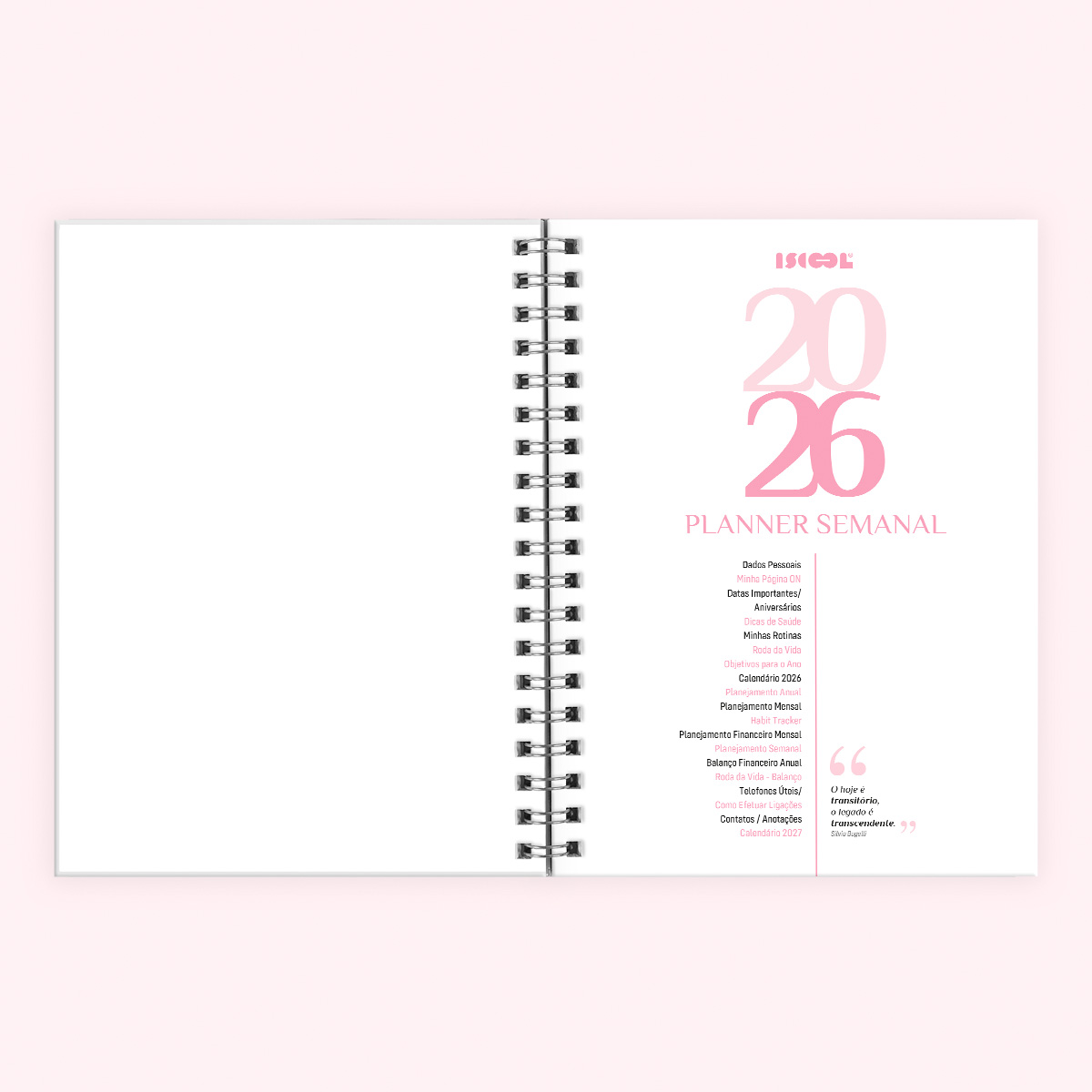 Em seguida, páginas para a ferramenta “Roda da Vida”, objetivos para o ano e organização da rotina. A seguir, há uma visão geral do calendário completo de 2026. Logo depois, temos o planejamento anual para anotar os objetivos e metas de cada semestre.