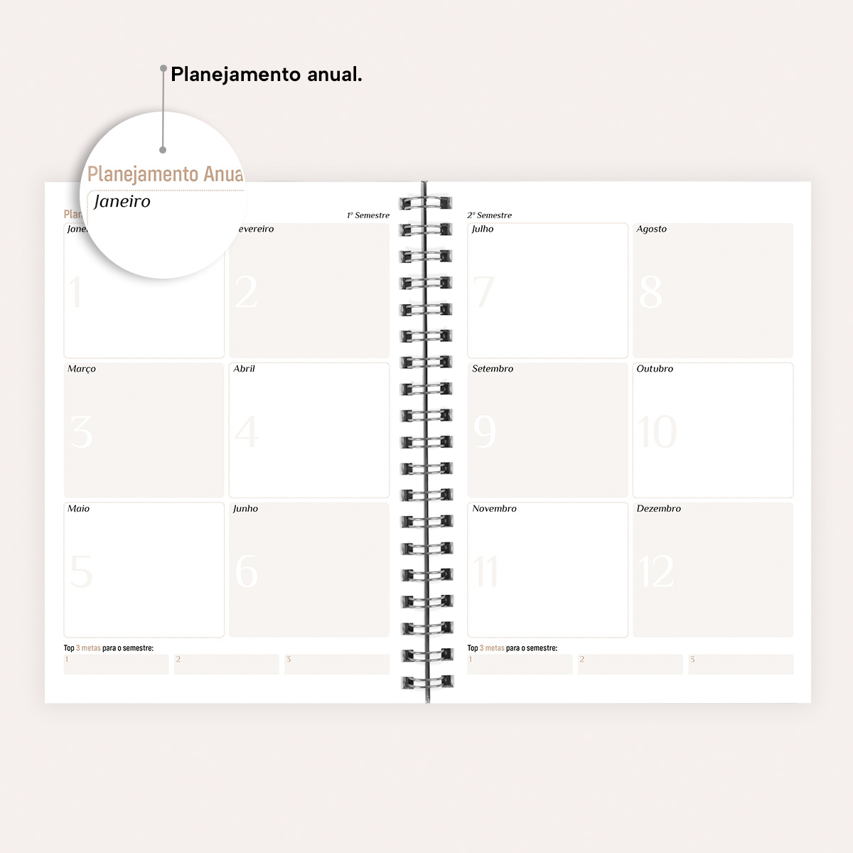 No início de cada mês, há um planejamento mensal, facilitando visualmente as suas principais anotações, um “Habit Tracker” para você desenvolver novos hábitos ou controlar os mais importantes, e ainda um planejamento financeiro, facilitando o controle das suas receitas e despesas.