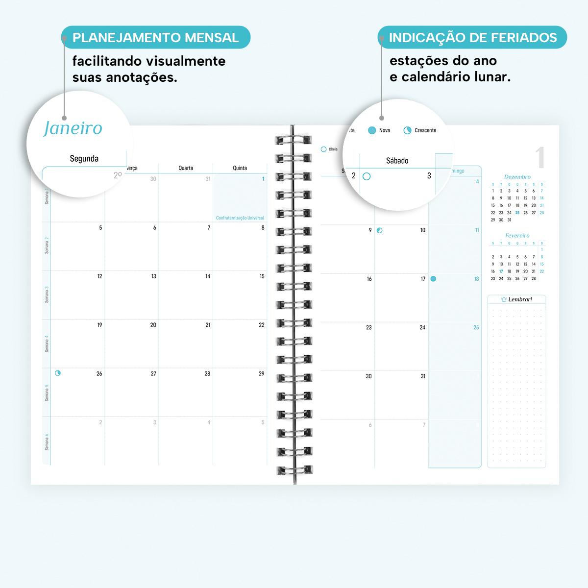 Além disso, cada página possui indicação de feriados, das estações do ano, calendário lunar, indicador do número da semana e frases inspiradoras.