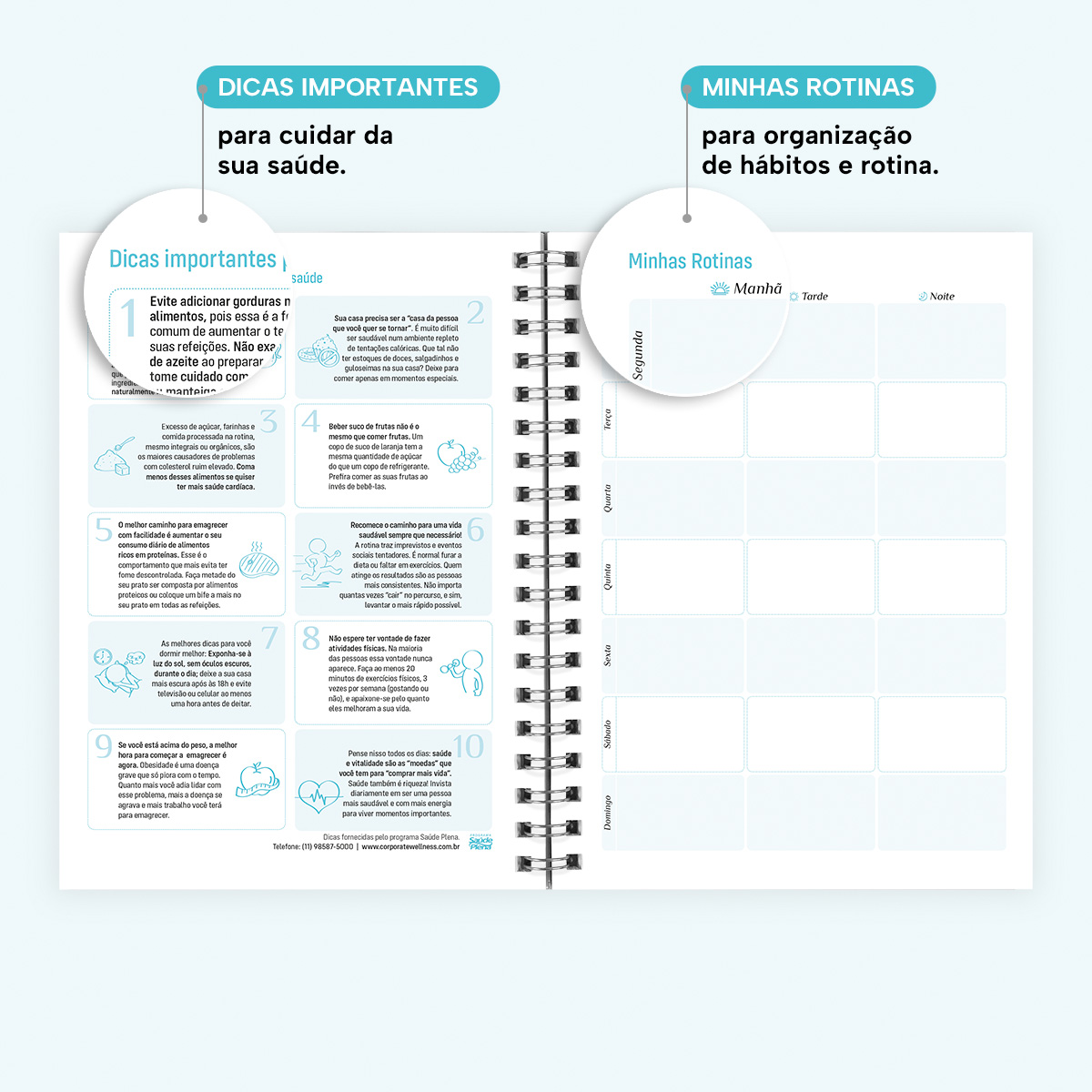 Ao final da agenda, há uma página com os principais números de telefone úteis, além de instruções sobre como efetuar ligações, uma agenda de contatos, um balanço financeiro anual, uma página com a ferramenta “Roda da Vida” para você comparar sua evolução pessoal em relação ao início do ano e o termômetro de metas, onde você poderá apurar os resultados de cada mês e fazer uma autoavaliação.
