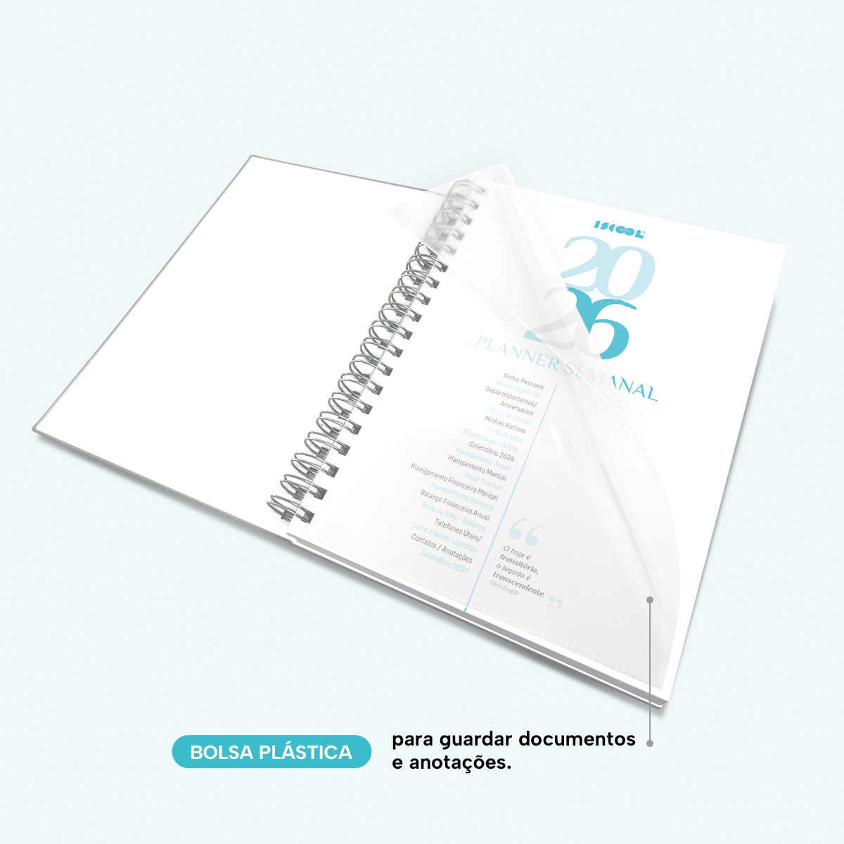 Bolsa plástica para guardar documentos e anotações.