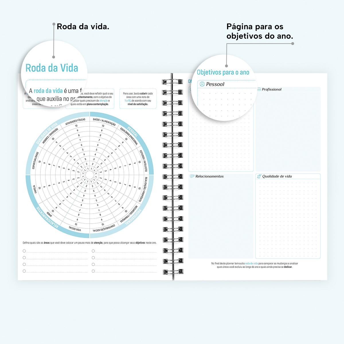 Ao final da agenda, há uma página com os principais números de telefone úteis, além de instruções sobre como efetuar ligações, uma agenda de contatos, um balanço financeiro anual, uma página com a ferramenta “Roda da Vida” para você comparar sua evolução pessoal em relação ao início do ano e o termômetro de metas, onde você poderá apurar os resultados de cada mês e fazer uma autoavaliação.