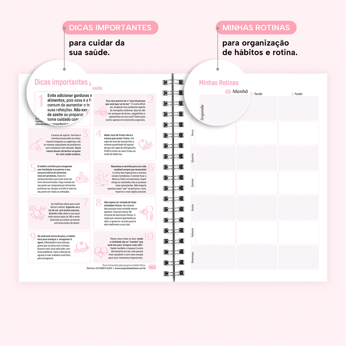 Ao final da agenda, há uma página com os principais números de telefone úteis, além de instruções sobre como efetuar ligações, uma agenda de contatos, um balanço financeiro anual, uma página com a ferramenta “Roda da Vida” para você comparar sua evolução pessoal em relação ao início do ano e o termômetro de metas, onde você poderá apurar os resultados de cada mês e fazer uma autoavaliação.