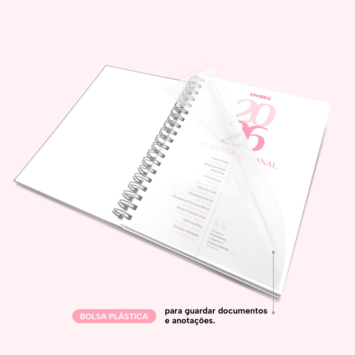 Bolsa plástica para guardar documentos e anotações.