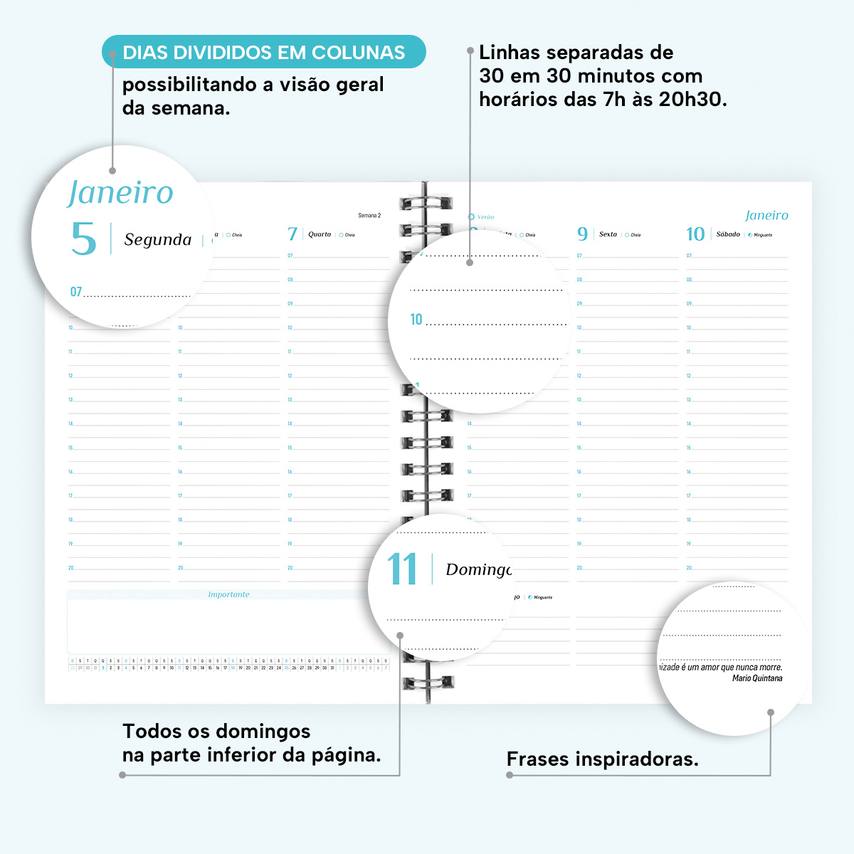 Além disso, cada página possui indicação de feriados, das estações do ano, calendário lunar, indicador do número da semana e frases inspiradoras.
