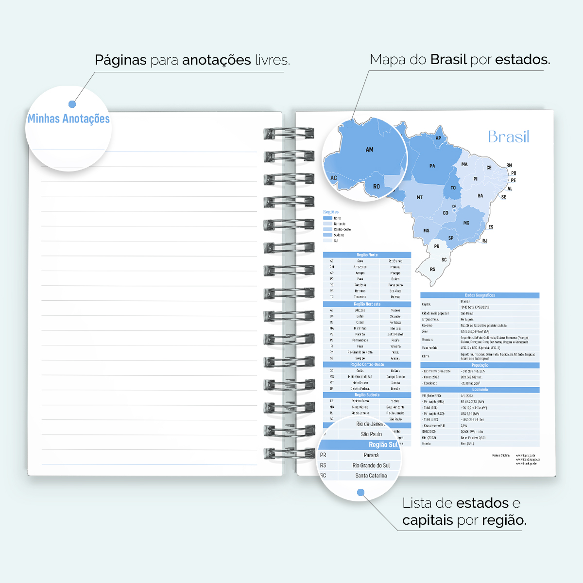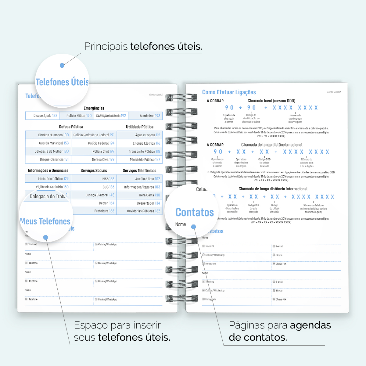 Ao final da agenda, há uma página com os principais números de telefone úteis, além de instruções sobre como efetuar ligações, uma seção dedicada a contatos, uma página em formato “bullet list” para itens de lista, páginas para anotações livres e um mapa do Brasil.