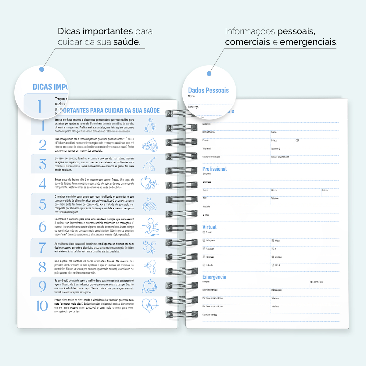 Logo no início, você pode preencher todos os seus dados pessoais, comerciais e emergenciais, seguido pela “Minha Página ON”, ideal para registrar suas contas digitais, com seus respectivos logins e senhas, e uma página de “Datas Importantes/Aniversários”, com os 12 meses do ano organizados para você anotar aniversários e datas a serem lembradas.